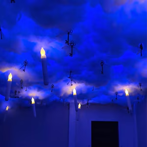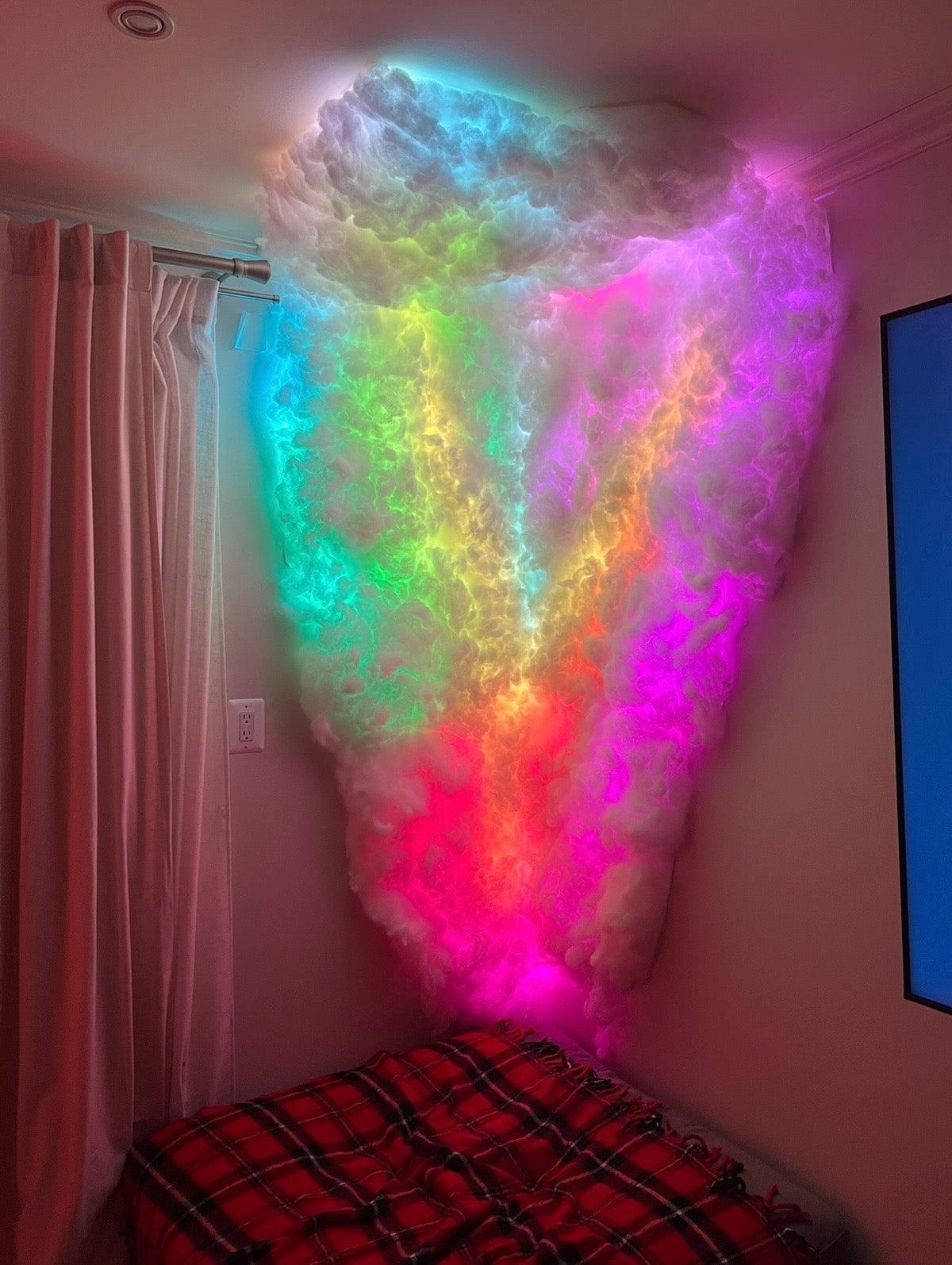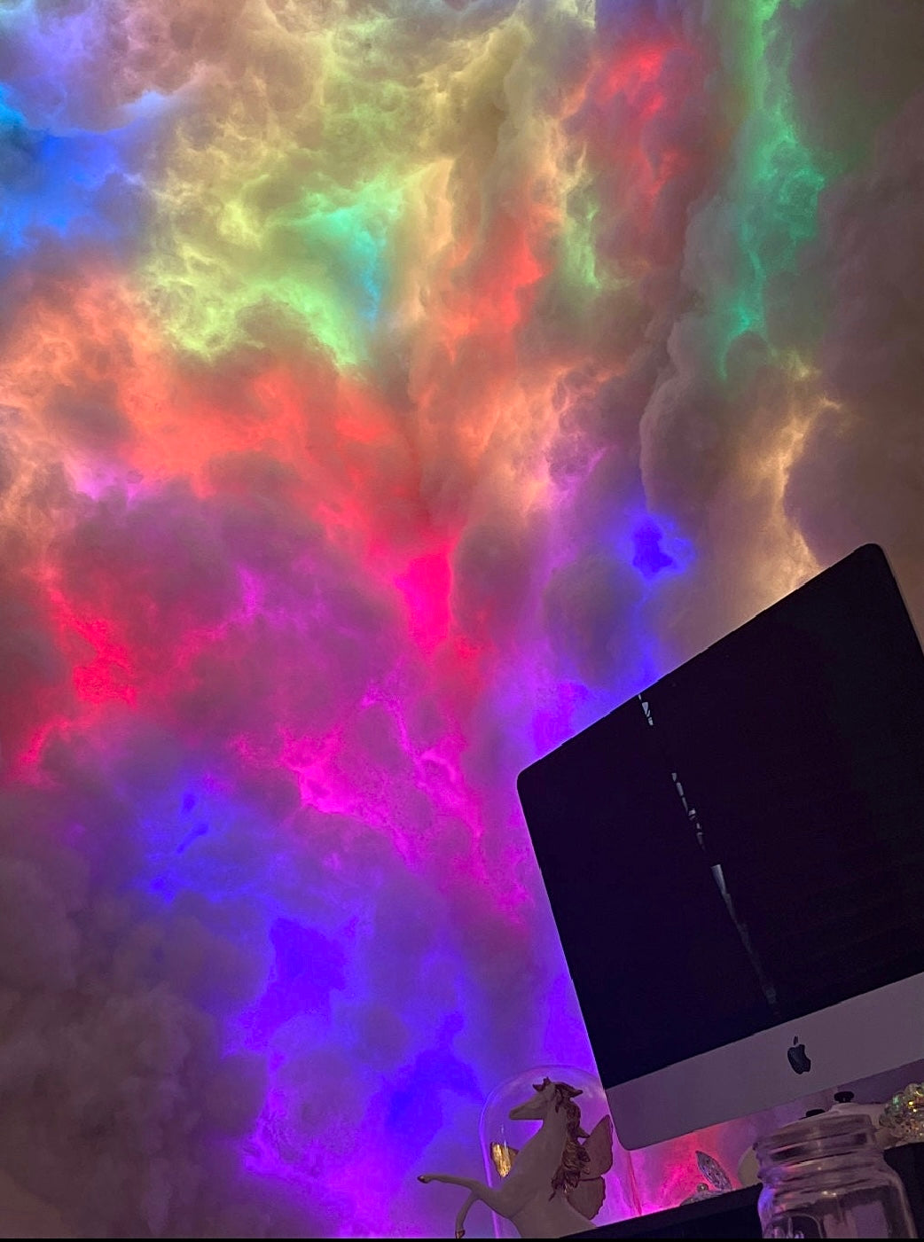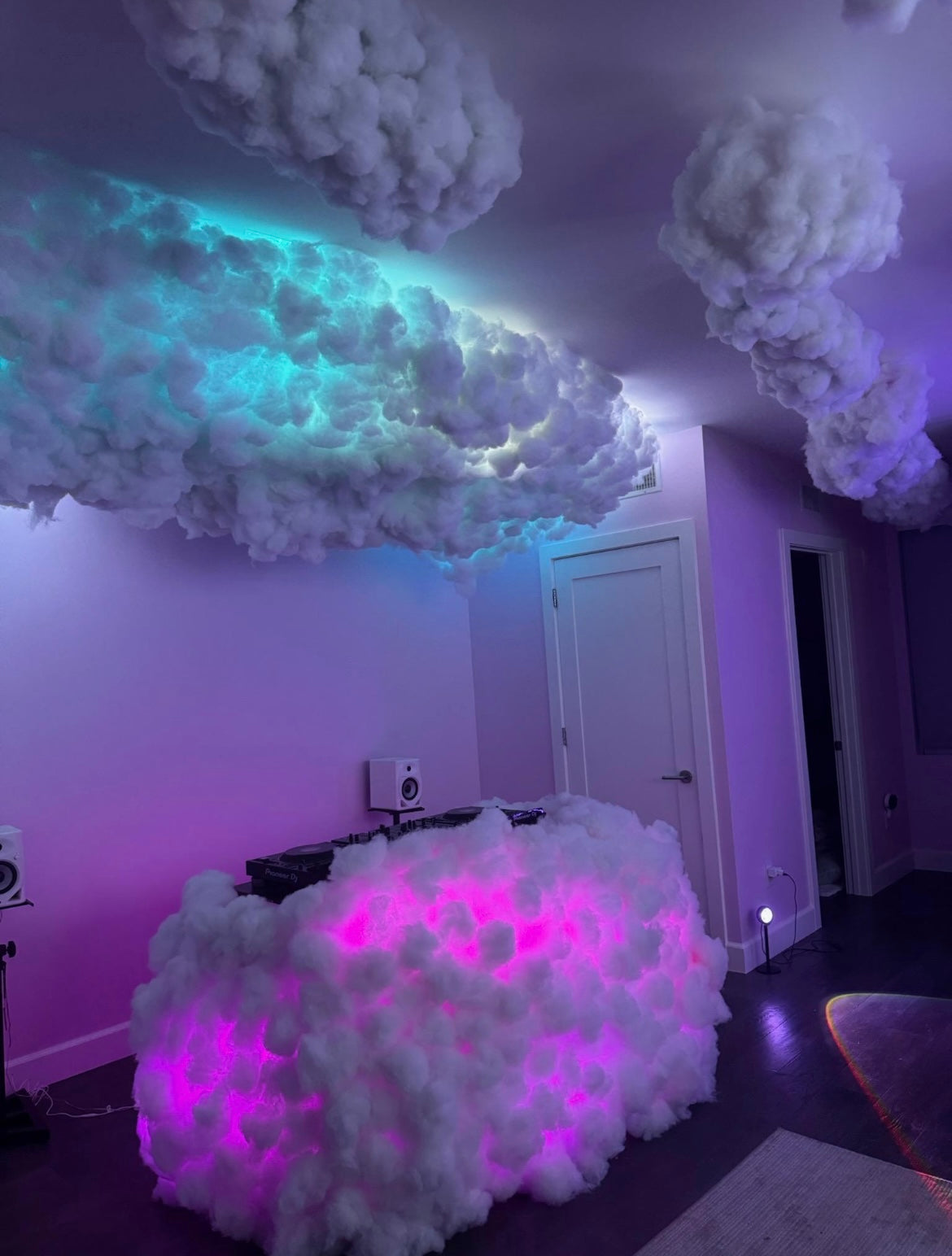 Cloud Panels are pre-made, fire-resistant, fluffy panels that easily attach to your ceiling or walls. Simply place LED lights first, then apply the panels for an immersive, glowing cloud effect.